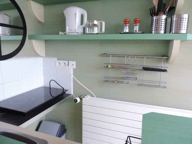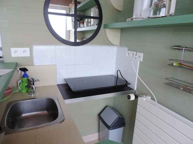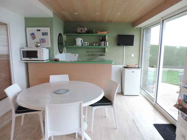 – Pièce à vivre ouvrant sur terrasse et jardin, avec partie kitchenette (2 plaques induction ,réfrigérateur table top), partie repas et partie salon avec un canapé d'appoint il est neuf pour deux personnes.