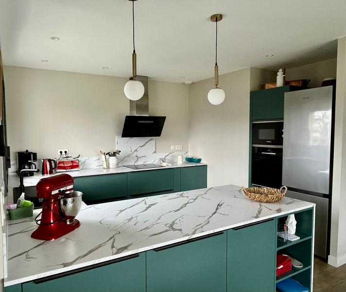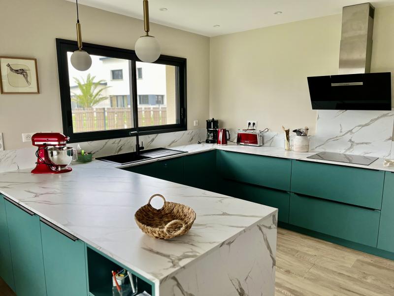 – Pièce à vivre avec partie cuisine aménagée, séjour, salon, donnant sur la terrasse