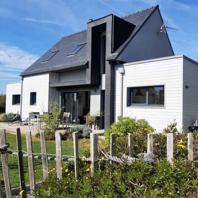 BELLE VILLA CONTEMPORAINE , sur jardin clos de 780m2, située entre Loctudy et Lesconil, proche de la plage de la Palud du Cosquer. Exp. Sud. Surface habitable: 120m2
