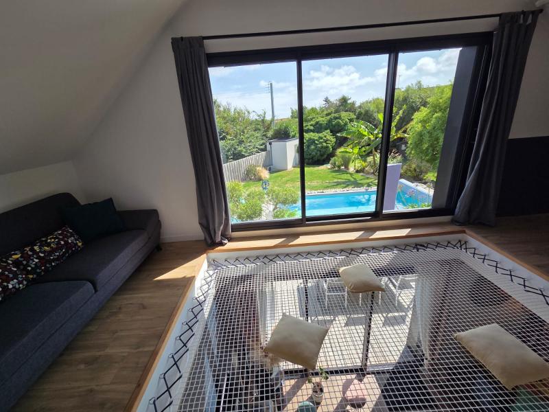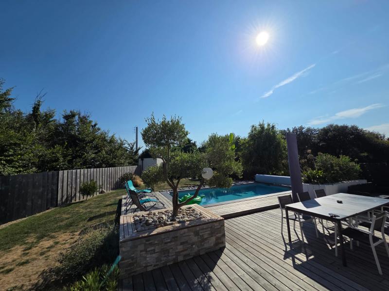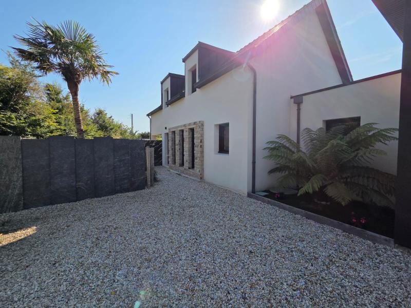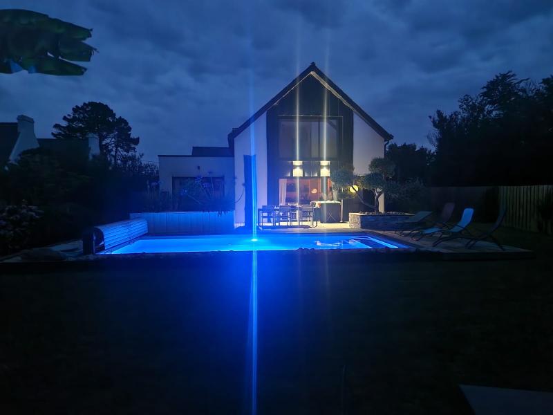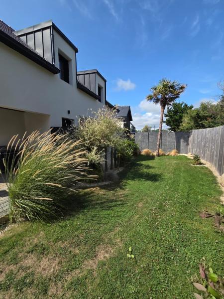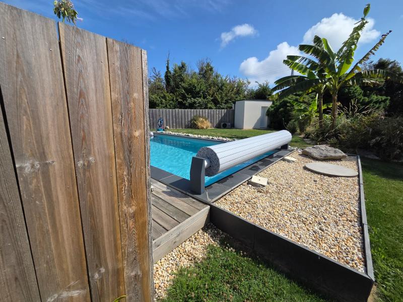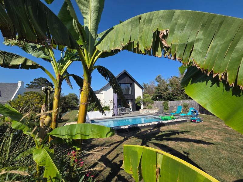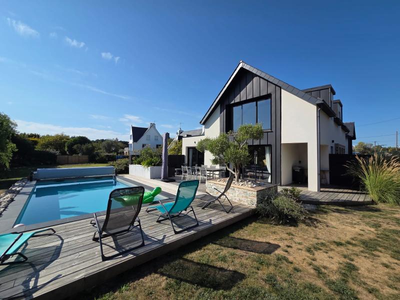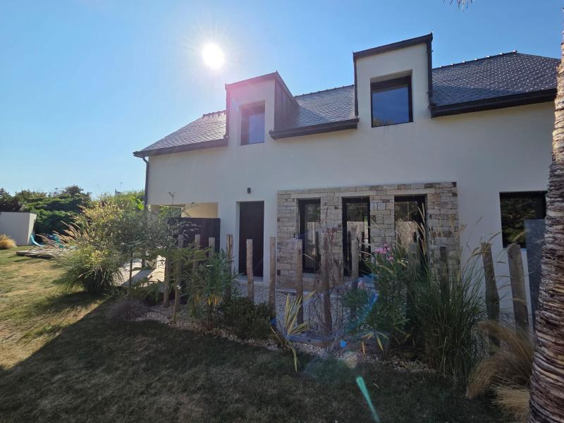 Belle villa contemporaine avec piscine chauffée, à quelques pas de la belle plage de Kersauz, en impasse dans un environnement résidentiel et calme, sur jardin partiellement clos de 600m2. Exposition Sud