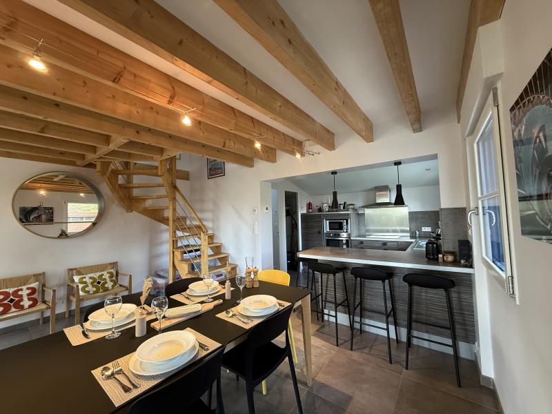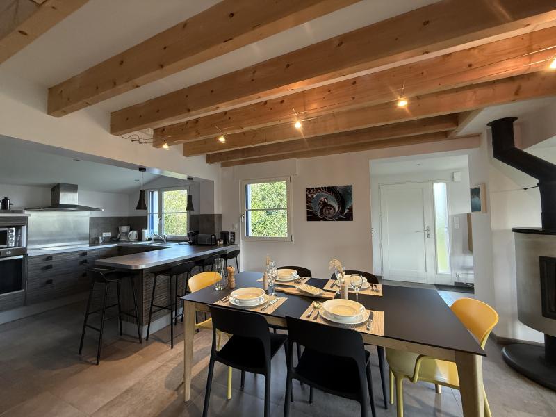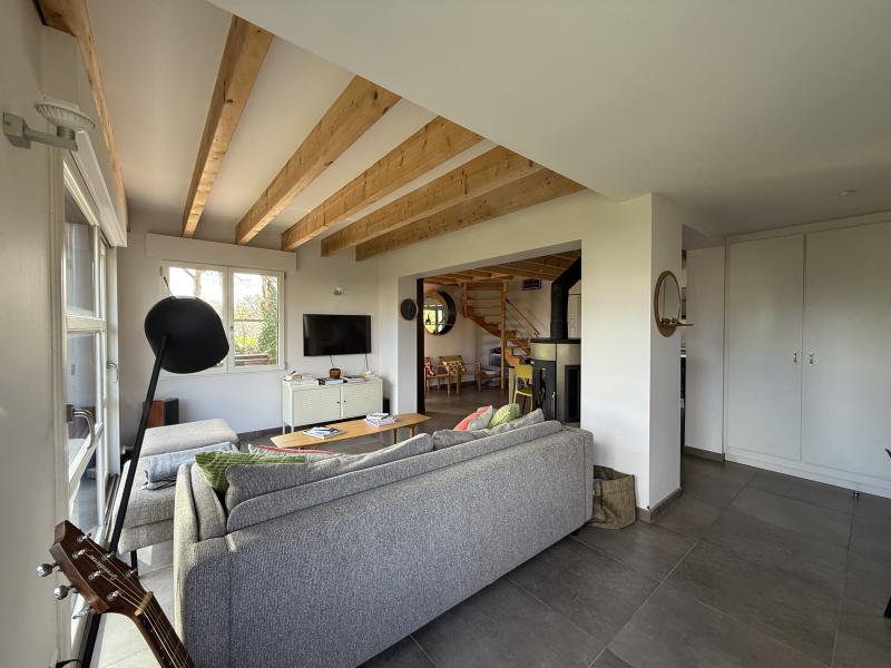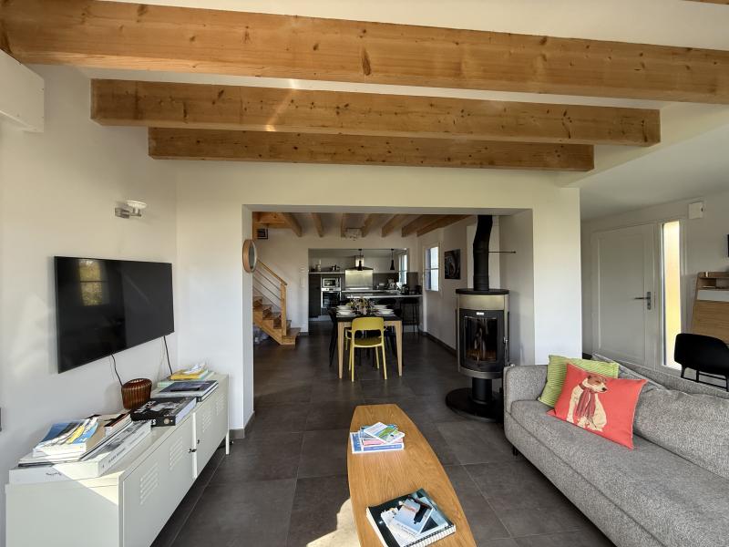 – Grand séjour ouvrant sur terrasse bois . Partie cuisine aménagée et partie salon avec insert : canapé convertible pour deux personnes.