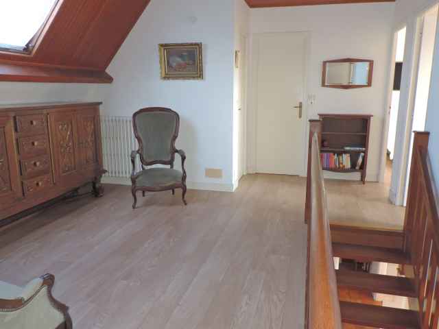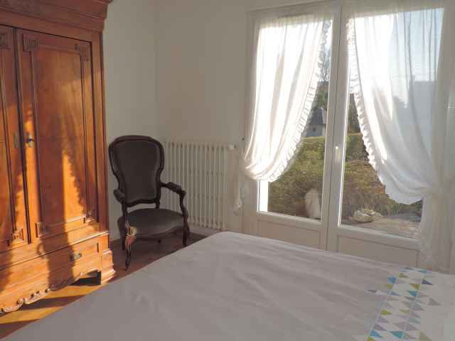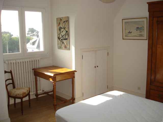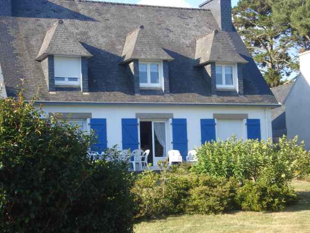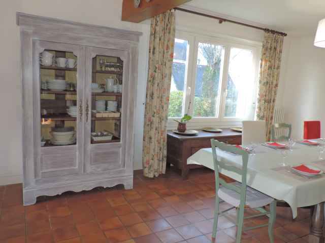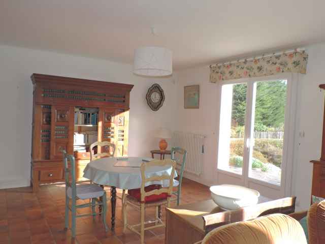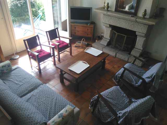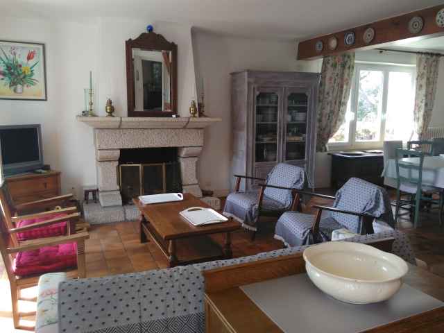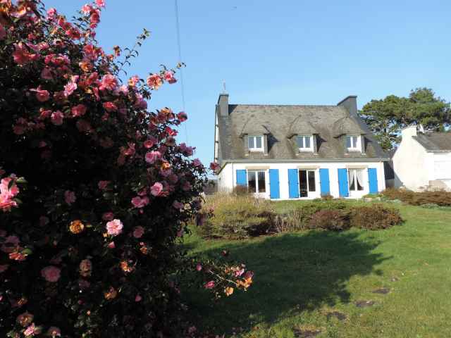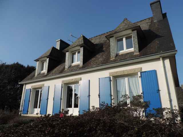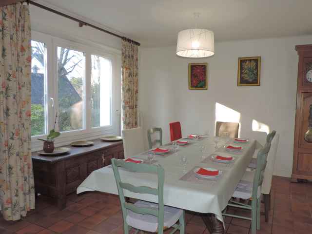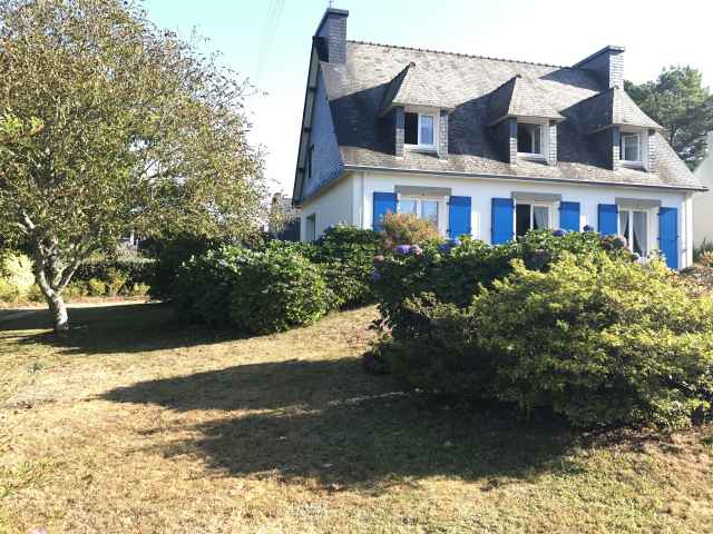 Grande maison Néo-Bretonne (constr.1970) sur jardin clos de 1500 m2 environ,rénovée en 2018, située dans une impasse en quartier résidentiel de Sainte Marine. Plage accessible par petit chemin communal face à la location. Stationnement des voitures dans le jardin. Exposition Sud. Surface habitable: 184 m2